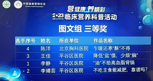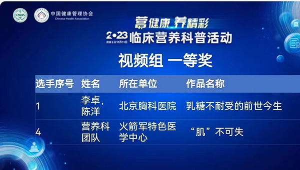 2023年11月11日上午,由中国医师协会、中国医师协会营养医师专业委员会、中国健康管理协会临床营养与健康分会联合主办的2023临床营养科普活动(北京赛区)在线上召开,我院营养科陈洋医生的科普文章《乍暖还寒“酥”不得》荣获图文组三等奖,李卓、陈洋医生的视频作品《乳糖不耐受的前世今生》荣获视频组一等奖,并将代表北京赛区参加接下来的大区赛比拼。
