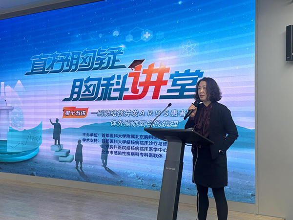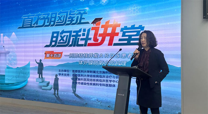 病例汇报环节由北京胸科医院呼吸与危重症医学科护士长赵艳丽主持。本次大查房围绕“一例肺结核并发ARDS患者进行体外膜肺氧合的护理”进行分享。该病例中患者因结核病引发ARDS,并发多脏器功能衰竭,给医疗和护理带来了极大的考验,通过体外膜肺氧合、血液净化、康复理疗、心理疗愈等,让患者转危为安,重获新生。