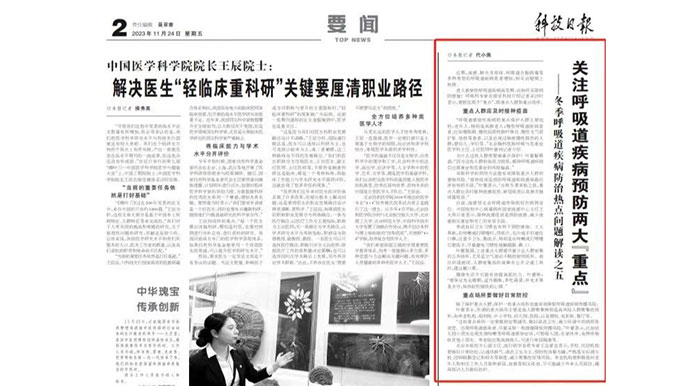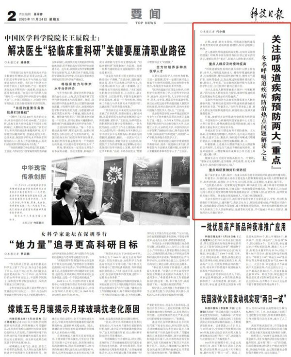 2023年11月24日,科技日报刊发对北京胸科医院呼吸与危重症医学科主任 主任医师叶寰的专访。