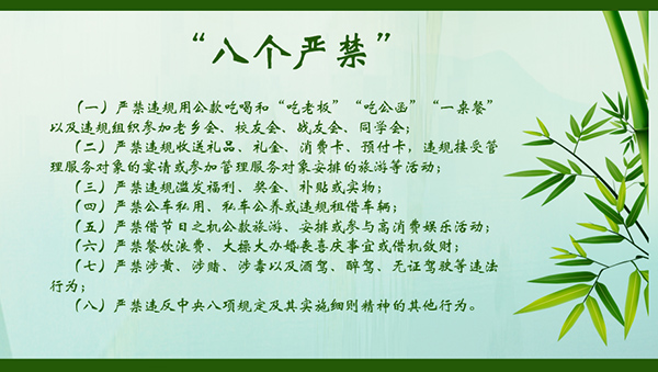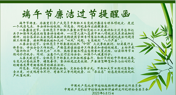 同时,医院党委、纪委向全体党员干部职工发出《端午节廉洁过节提醒函》。要求,全体党员干部职工要一以贯之深入贯彻落实中央八项规定精神,旗帜鲜明抵制和反对“四风”问题,自觉做到“八个严禁”,深刻汲取“4•18”火灾事故教训,守住安全工作红线,切实保障好节日期间诊疗秩序,自觉反对餐饮浪费、铺张奢侈,过廉洁、安全、文明的端午节。