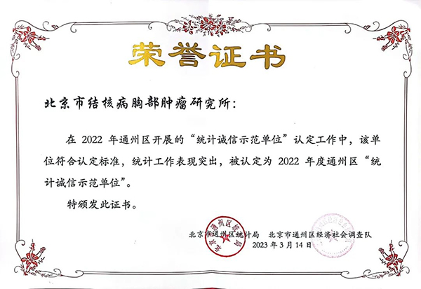 北京市结核病胸部肿瘤研究所荣获通州区“统计诚信示范单位”称号