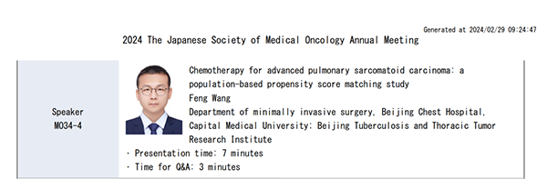 为期三天的日本临床肿瘤学会年会于2024年2月22日至24日在日本名古屋市名古屋国际会议中心召开,本次会议共有来自50多个国家上万名学者参加。北京胸科医院微创诊疗中心研究团队的王丰医生受邀参加会议并做大会发言,展示我院肺癌研究方面的最新进展。