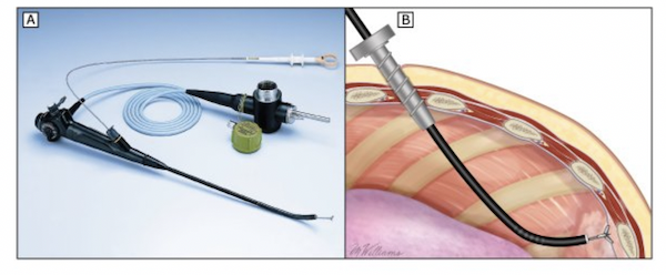 内科胸腔镜是一种呼吸系统疾病诊疗过程中常用的内镜技术,创伤更小,医疗费用更低,并且诊断和治疗有效率高,并发症少,在疾病的诊治方面有巨大的应用价值,目前在临床上已得到广泛应用。内科胸腔镜在局麻下(或加用静脉镇静)即可进行,一般不需要全身麻醉。前端可弯曲的内科电子胸腔镜可在直视下进行活检和治疗。