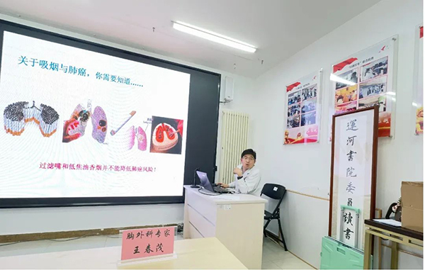在新城南街社区党群服务活动中心,义诊活动如火如荼地展开,社区居民座无虚席。健康知识科普环节,胸外一科主任医师阮军忠用通俗易懂的方式为社区居民科普了《肺结节那些事》、心脏中心主任医师仝其广深刻清晰地为社区居民讲解了《高血压的诊断与分级》、胸外一科医生王春茂用诙谐风趣的风格讲述了《拒绝烟草,远离肺癌》。