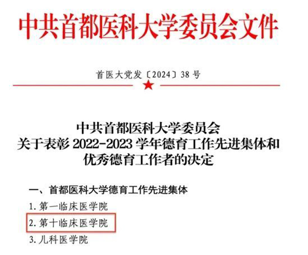 喜报!首都医科大学第十临床医学院(北京胸科医院)荣获“首都医科大学2022-2023学年德育工作先进集体”称号
