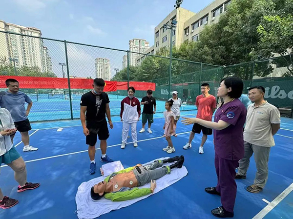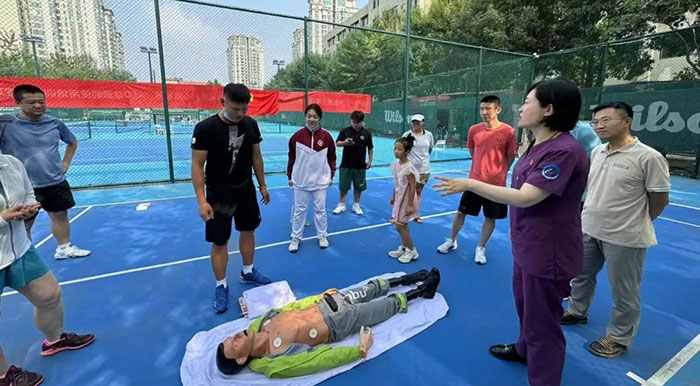 7月16日下午3点,我院肿瘤二党支部来到了地处北京市通州区北苑的胜赛点网球场,对球场的工作人员、教练员以及球场旁边科技园的工作人员进行心肺复苏技术及AED除颤仪使用培训。