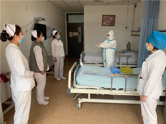 李宝兰主任通过科室微信工作群传达医院对新冠肺炎防控工作的会议精神、文件、制度、通知、要求等,确保上传下达到位,不脱节,并部署每天的工作;科室核心组成员每天组织大家学习、解读新冠肺炎相关诊疗方案、安全防护和院感管理,重点环节和问题进行讨论、分享和提问考核;为了提高科室护理人员对新冠病毒肺炎相关防护操作技能,委派备战一线的医护人员为组长,分组对科室医护人员进行一对一辅导、考核,做到全员参与、人人掌握。