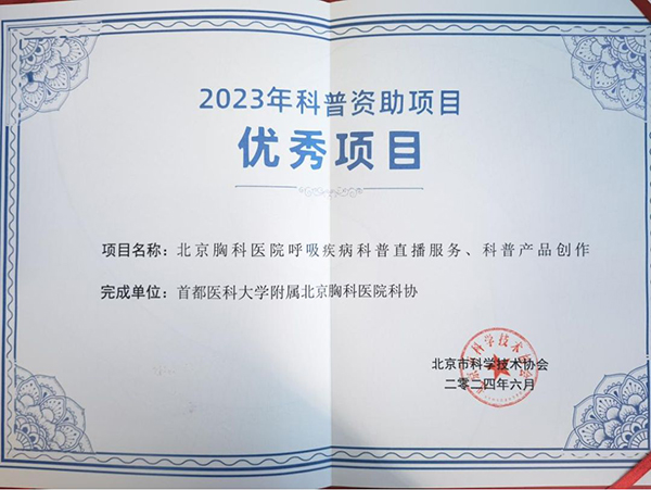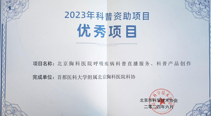 近日,首都医科大学附属北京胸科医院科学技术协会承担的“北京胸科医院呼吸疾病科普直播服务、科普产品创作”项目入选北京市科协“2023年科普资助项目优秀项目”奖,值得一提的是北京胸科医院是30家获奖单位中唯一的医疗单位。该项目由医院宣传中心联合呼吸与危重症医学科共同完成。