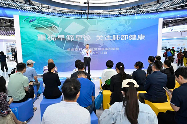 除了携多项创新产品参展外,北京胸科医院还在服贸会期间参加了公共卫生国际论坛、2024首都医工融合创新发展论坛、2024中国医学科技创新和成果转化投资论坛、精品健康科普专题讲座、成果发布及签约等多项重要活动。在高质量发展成果公益展区,副院长杜建带领胸科医院胡瑛、杨新婷、秦娜、王东昌、刘洋、朱钧、马皎洁等专家带来《重视早筛早诊,关注肺部健康》为主题的精品科普讲座,讲解如何通过早筛早诊预防肺部疾病。
