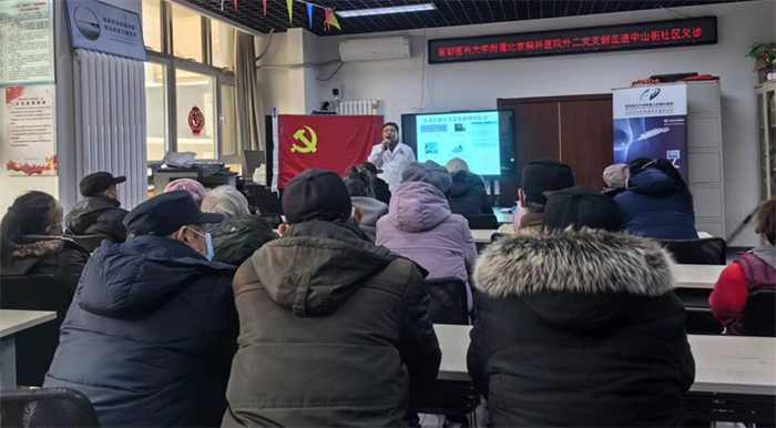 在活动前,北京胸科医院的何玉琦、赵双涛、王宇轩三位医师就肺结节、乳腺肿块、甲状腺结节和肠息肉等问题开展健康宣教,通过生动形象的病例讲解、诙谐幽默地知识宣讲,唤起了社区居民的健康体检意识,使“定期查体、有病不拖”的理念更急深入人心。