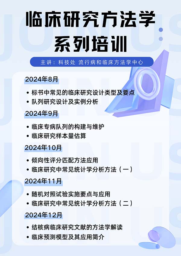 为了进一步提升我国临床医学研究的整体水平,促进临床研究方法的科学应用与创新,流行病和临床方法学中心特此举办“临床研究方法学”为主题的系列培训活动。该系列活动旨在通过系统的理论学习与实践案例分析,为广大医务工作者、科研人员及研究生提供一个提升临床研究设计与实施能力的平台。