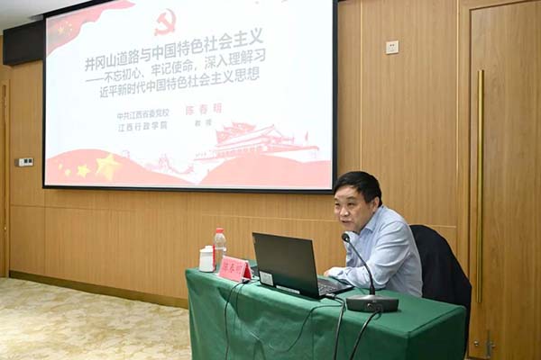 中共江西省委党校江西行政学院陈春明教授为全体学员作主题为“井冈山道路与中国特色社会主义——不忘初心、牢记使命,深入理解习近平新时代中国特色社会主义思想”的理论授课,陈春明从井冈山道路的历史出发,深入浅出地分析了井冈山道路和中国特色社会主义道路的内在联系,深刻阐述了中国特色社会主义道路实际上就是井冈山道路在新的历史条件下的延伸。陈春明的讲课内容丰富、逻辑严谨、语言精练,为党员们提供了一堂丰盛的精神大餐。