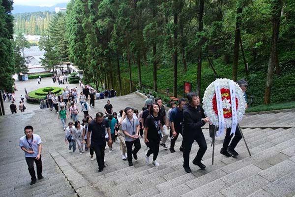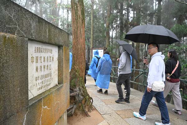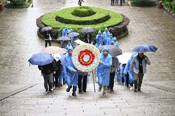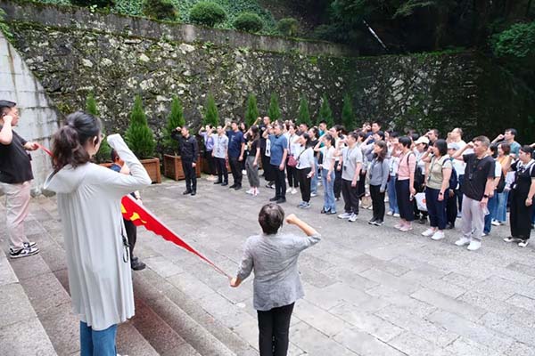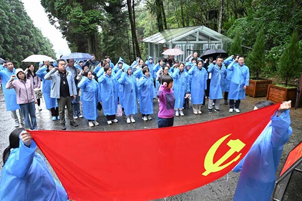在细雨蒙蒙中,党员们来到了井冈山革命烈士陵园,当时牺牲的英烈共4.8万余名,但只有15744位留下了姓名。在潘军华同志、杜晔同志的分别带领下,党员们向英烈默哀、敬献花圈,并面向党旗重温入党誓词。