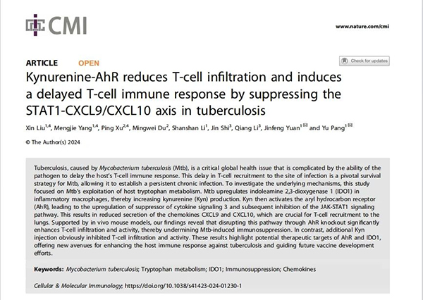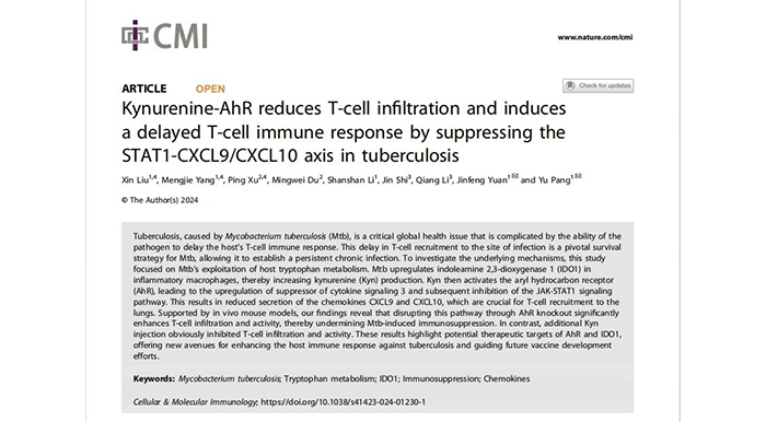近日,首都医科大学附属北京胸科医院细菌免疫室逄宇教授团队在国际权威期刊《Cellular & Molecular Immunology》(中科院1区TOP,IF=21.8)上发表题为“Kynurenine-AhR reduces T-cell infiltration and induces a delayed T-cell immune response by suppressing the STAT1-CXCL9/CXCL10 axis in tuberculosis”的研究论文。该研究揭示了结核病(TB)病原体结核分枝杆菌(Mtb)如何利用宿主的色氨酸代谢途径来延迟T细胞免疫反应,从而为结核病的治疗和疫苗开发提供了新的靶点。北京胸科医院细菌免疫室博士研究生刘欣、杨梦杰,苏州市第五人民医院胥萍为论文共同第一作者,北京胸科医院细菌免疫室助理研究员袁金锋和逄宇教授为共同通讯作者。