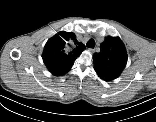 检查前影像科医师评估患者身体状况,仔细评价患者胸部增强CT影像,判断其是否适宜进行CT引导下穿刺,是否为CT引导下肺穿刺活检术的适应症,明确执行该手术对患者的诊疗意义,初步确定穿刺路径及取材部位。
