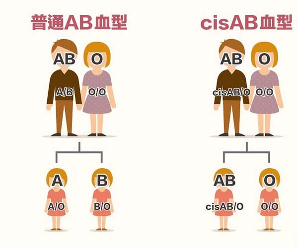 RhD阴性血通常被老百姓称作“熊猫血”,其发生概率在汉族人群中3‰~4‰,cisAB型血又叫顺式AB,在人群中的发生频率在1/58万~1/17万,比俗称熊猫血的RhD阴性要稀有数百倍,被称为“黄金血”。cisAB型血型大多数都是基因突变引起的,常与家族遗传有关。传统观念认为AB型与O型夫妻无法生出AB型,A基因和B基因位于两条不同的染色体上,两条染色体分别来自父母亲中的一方,当继续向后代遗传时,只能随机将其中的一个基因遗传给子女。即AB型的丈夫、O型的妻子,子女的基因组合只可能是AO或BO,表现在血型上即A型或B型,因此一般认为不可能出现AB型的子女,然而这种情况在医学上存在例外,那就是如果其中一方的血型并非普通的AB型,而是稀有的cisAB血型,那么就能生出AB型的孩子,这种情况很容易会导致家庭矛盾的发生。