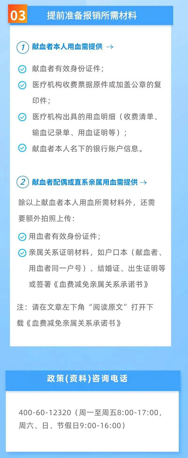 以前,报销用血费有不少繁琐的报销程序,现在,可以足不出户即可发起报销,血费报销实现“零跑腿”!那么,怎么才能实现便捷办理临床用血费用减免呢?我们一图为您解答。如果您在北京完成无偿献血,您本人或配偶或直系亲属用血,可按照《北京市献血条例》相关规定,在首都献血微信公众号进行自助办理血费减免。若您还有其它疑问可致电通州区中心血站献血服务咨询电话:010-69513399