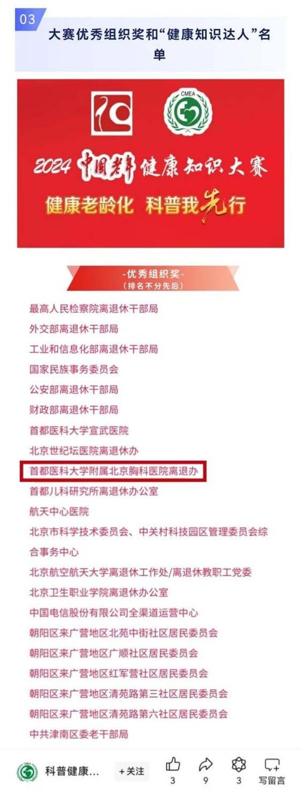 喜报 | 北京胸科医院在中国老年健康知识大赛中获奖