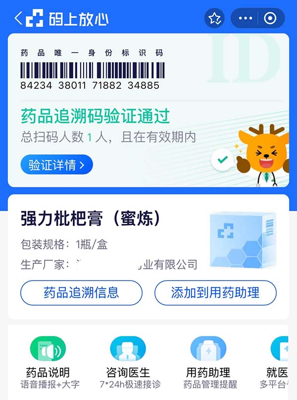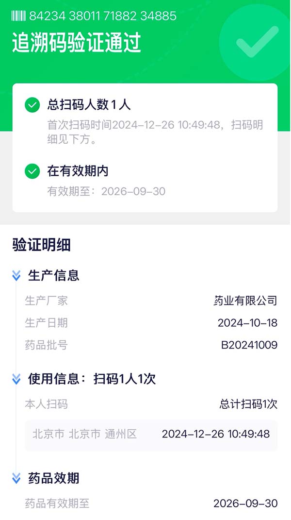 每张“身份证”都是独一无二的,如果发现药品追溯码重复,我们就能轻松分辨出存在假药现象,可以有效防止假药混进市场。