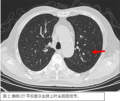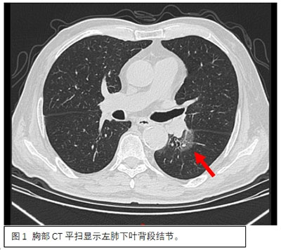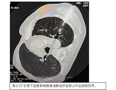 患者因体检发现肺部阴影到北京胸科医院就诊治疗。据胸外一科主任阮军忠介绍,患者左肺有2个需要治疗的高危结节,大者位于左肺下叶背段,最大径达30mm(图1),另一个结节位于左肺上叶尖后段,直径为8mm(图2);同时,患者高龄75岁,合并多年高血压、冠心病、糖尿病史。若均通过外科手术切除高危结节,则会损失较多肺功能,且手术创伤大、时间长,围术期心血管事件风险明显升高。根据患者病情,胸外一科阮军忠团队与CT介入科主任侯代伦及副主任医师王东坡团队联合进行了术前讨论和准备,并与患者家属充分沟通后,制定了治疗方案,决定在同一天,先由王东坡团队于放射科局麻下行CT引导下经皮穿刺微波消融手术治疗左肺上叶尖后段结节(图3),随后由阮军忠团队于手术室全麻下行胸腔镜下左肺下叶背段切除术(图4)。