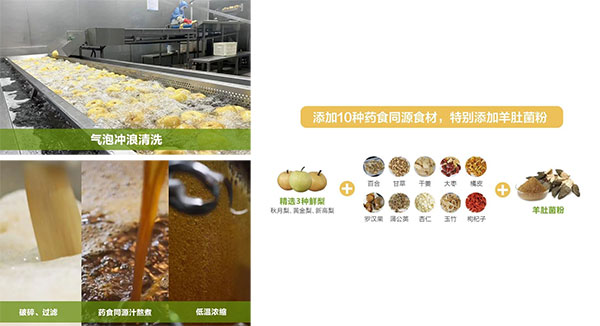 15公斤鲜梨经过【清洗】【破碎过滤】【药食同煮】【低温浓缩】等工艺,至少17个小时的熬煮后,才能熬制出1公斤梨膏。整个熬制过程,除清洗梨时用到水之外,其他环节均未添加一滴水。与市面上常见的其他梨膏相比,未额外添加增稠剂、防腐剂、香精色素、麦芽糖、蔗糖等添加剂,保证梨膏的食品安全和质量标准,确保其富含植物化学物,且完成农药、重金属等残留检测后方会推向市场。