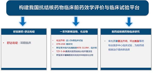 该项目围绕抗结核新药研发,从无到有率先构建国际接轨、国内领先的抗结核新药筛选与临床前药效学评价体系及临床试验研究平台,全面提升我国抗结核新药从临床前到临床整体研究能力和水平。项目中研发 3 款具有自主知识产权的抗耐药结核 1 类新药,其中抗耐药结核新药舒达吡啶首个进入III 期临床研究,有望实现较国际耐药结核病新药贝达喹啉活性增强、副作用降低的目标。