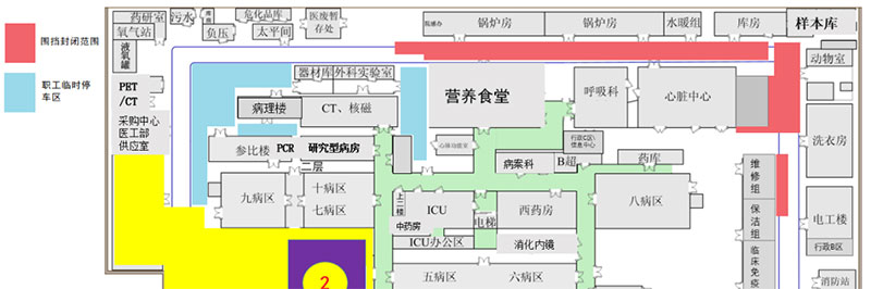 ②洗衣房-心脏中心-呼吸科-锅炉房沿线保留南北两侧人行通道,车辆不可通行。