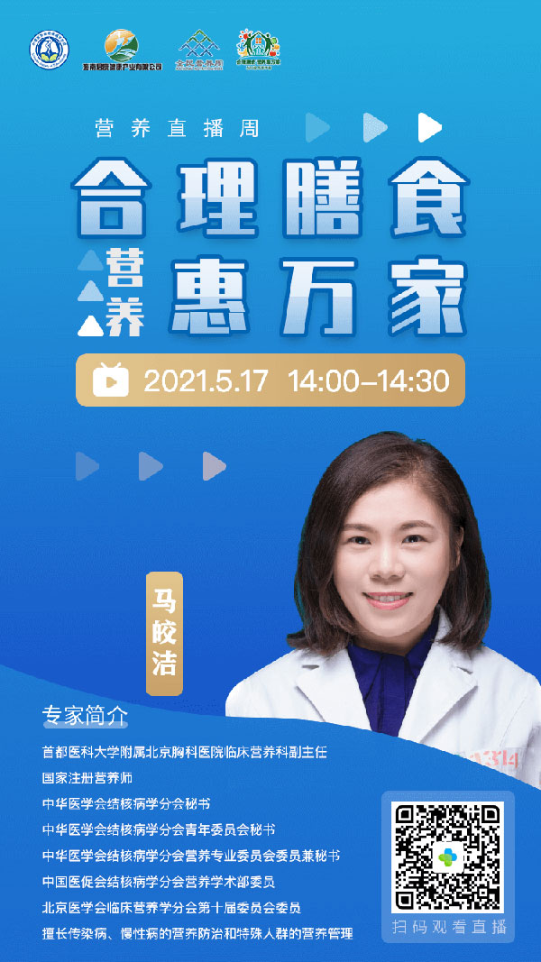 2021年全民营养周期间,我院临床营养科作为中华医学会结核病学分会营养专业委员会秘书单位组织了连续七场的线上讲座,其中我科副主任马皎洁作为首场讲课嘉宾,为大家带来了《合理膳食,营养惠万家》的授课内容。