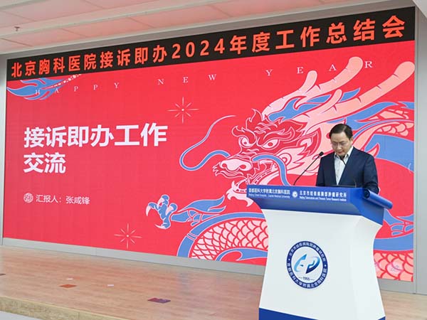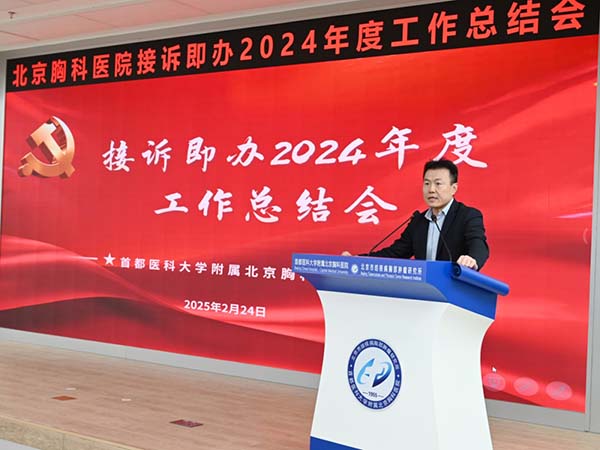 2025年2月24日,首都医科大学附属北京胸科医院组织召开2024年度接诉即办工作总结大会。北京市卫生健康委安保处处长王开斌,我院党委书记潘军华,党委副书记、院长李晓北,副院所长等领导班子成员,各科室主任,护士长和接诉即办督办员参加了此次会议。会议旨在回顾过去三年的接诉即办工作成效,梳理存在的问题,并围绕“主动治理、提质增效”展开经验交流,为2025年接诉即办工作的持续优化奠定基础。会议由院长李晓北主持。