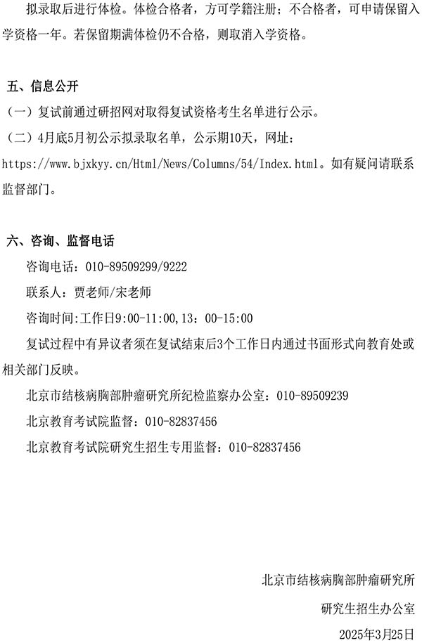 北京市结核病胸部肿瘤研究所2025年硕士复试工作办法