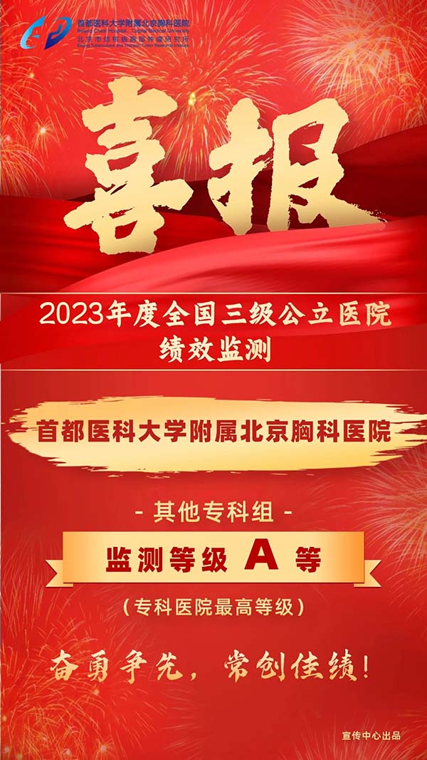 2025年3月18日,2023年度全国三级公立医院绩效监测结果放榜,首都医科大学附属北京胸科医院再创佳绩,在“其他专科组”获评为A等,这是我院连续四年跻身专科医院最高监测等级。