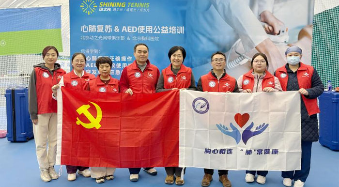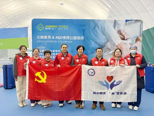 3月4日,肿瘤二党支部携手院团委、南丁格尔志愿护理服务队开启 2025 年度第一次“胸心相连,肺常健康” 特色公益活动,来到朝阳区来广营一处网球馆,进行心肺复苏技术及 AED 除颤仪使用培训。肿瘤二党支部书记胡瑛、院团委书记李波、放疗科主任医师张旭率队参加此次活动。