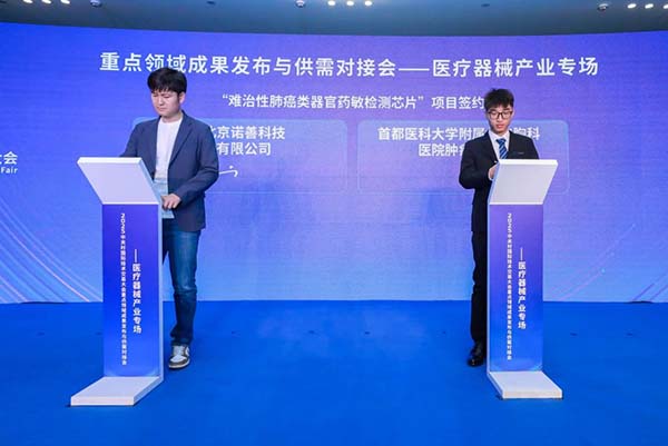 日前,2025中关村论坛年会中关村国际技术交易大会在京举办。在重点领域成果发布与供需对接会——医疗器械产业专场中,首都医科大学附属北京胸科医院肿瘤中心代表与北京诺善科技有限公司代表进行了《难治性肺癌类器官药敏检测芯片》项目签约仪式。