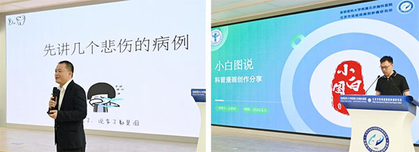 活动中,我院胸外科首席专家、主任医师支修益分享了他多年来从事科普工作的经验,强调科普需“接地气、讲实效”,要从群众关心的健康痛点出发,用通俗语言解读专业知识。科普团成员、口腔科副主任医师吴斌现场带来《智齿到底该不该拔》的科普讲座展示,以临床案例结合图文演示,将复杂的医学问题转化为易懂的生活常识。胸外科白哲昕则分享了自己的科普故事,他发挥画漫画特长,以 “医疗漫画” 这种新颖形式呈现健康知识,为科普工作注入艺术活力,展现了医疗科普的多元创新路径。
