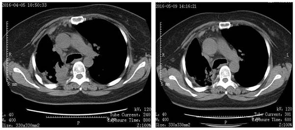 ↑患者十六线治疗一月后PR,肺内病灶明显缩小