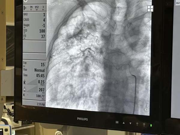 中心投入运行的号角刚刚吹响,一位因既往重症肺结核导致“毁损肺”的患者被紧急送入我院急诊科。影像学检查显示其肺部结构严重破坏,肺血管广泛畸形、迁曲、紊乱,如同布满了“不定时炸弹”的危险雷区,常规止血手段效果有限且风险极高。患者迅速由急诊转入呼吸科,咯血中心团队立即启动应急响应。在中心负责人王东昌带领下,介入诊疗团队凭借高超的血管造影技术和三维重建能力,在错综复杂的血管网络中精准定位到多支出血的“罪魁祸首”。手术台上,医生们屏气凝神,操作导管如臂使指,精准地将栓塞材料送达目标血管,成功实现了对多支畸形出血血管的介入封堵止血。