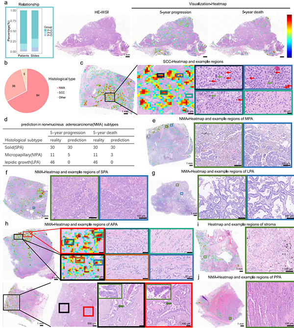 通过模型可视化技术,研究团队揭示了多个与预后强相关的数字化病理特征。例如,在对非黏液性腺癌(NMA)亚型的分析中,模型发现微乳头状腺癌(MPA)和实体腺癌(SPA)区域存在大量风险热点,而这些区域在世界卫生组织(WHO)最新版胸部肿瘤分类中被归为高级别模式。相反,被认为预后良好的肺泡腺癌(LPA)区域则很少被识别为风险热点。一些基质区域也发现存在风险热点,如微血管、成纤维细胞和细胞外基质等。这些都是肿瘤微环境的主要组成部分,对肿瘤的发生、发展和预后有着重要影响。