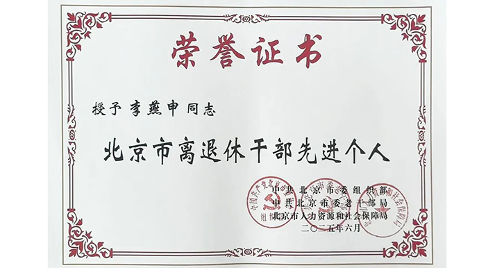 近日,在2025年中共北京市委组织部、 中共北京市委老干部局、北京市人力资源和社会保障局联合开展的北京市离退休干部先进集体、先进个人和老干部工作先进集体、先进个人评选表彰中,北京市卫健委推荐的李燕申同志凭借其卓越贡献,荣获“北京市离退休干部先进个人”荣誉称号。