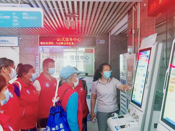 培训环节,医务处社工团队设置了理论与实操双轨并行的课程体系:在医务处会议室,志愿者系统学习了医院环境布局、服务核心规范与关键注意事项,为安全、高效服务打下坚实基础。现场还就志愿服务激励制度展开了互动讨论,激发持续服务热情;随后,课堂移至门诊二部大厅一层,医务社工化身“教练”,手把手指导志愿者掌握小程序挂号、自助机服务等关键操作技能。挂号大厅内,每位志愿者都进行了现场演练,真正实现“从懂到会”的能力转化。