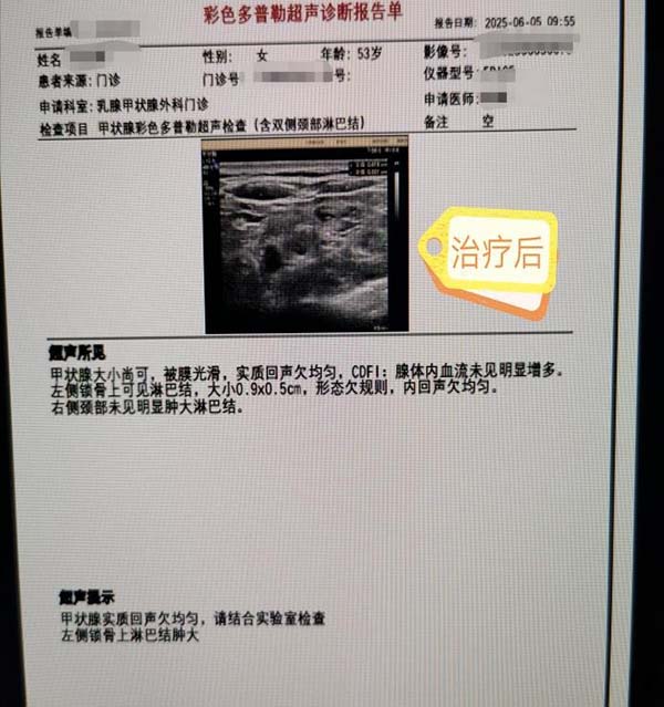 四个月后的春日,冯阿姨拿着复查单走进诊室时,声音里带着压抑不住的喜悦:“医生您看,结节没了!”超声报告清晰显示,左叶 0.4×0.2cm的结节已消失,锁骨上淋巴结从 1.6×0.4cm缩小到0.9×0.5cm。对比 2022 年以来几乎无变化的检查记录,阿姨突然很感慨:“三年了,总算能睡踏实觉了。”