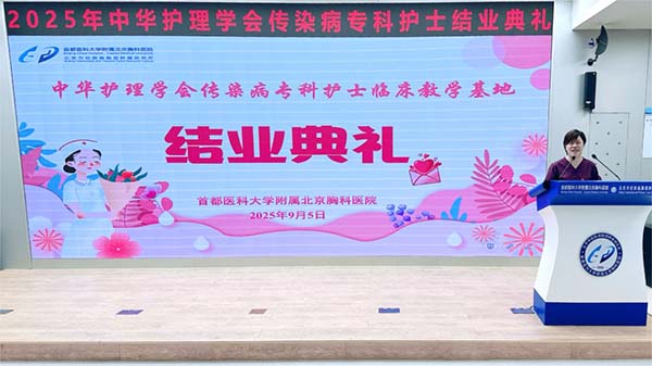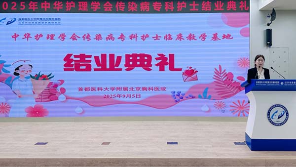 北京胸科医院护理部副主任律晨在结业典礼上致辞并表示传染病专科护士培训是教学相长的重要平台,不仅帮助学员夯实专业基础,掌握专科知识,也为培训基地积累了丰富的教学经验。传染病护理是守护人民健康的重要防线,在向顺利完成认证的学员表示祝贺的同时希望大家未来能以更高的标准投身传染病护理,用专业守护生命,用行动践行诺言,不断推动传染病护理事业迈向新台阶。