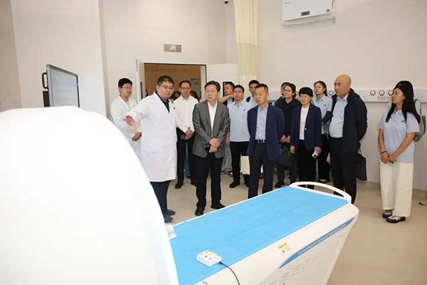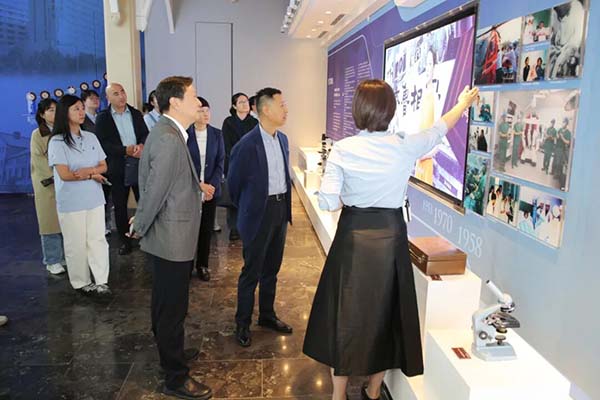 研学团首站到访山东大学齐鲁医院,受到山东大学齐鲁医学院党工委书记、齐鲁医院党委书记陈鑫的热情接待。陈鑫陪同研学团参观了院史馆(广智院)、零磁医学中心及基础医学研究中心。百年院史的厚重积淀、先进的科研设施和前沿的临床技术给研学团留下了深刻印象。随后,双方在座谈会上展开深入交流。