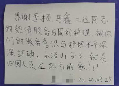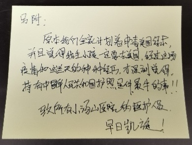 没想到我们的举手之劳,竟给他留下这么深的印象。这件事也让我想到,作为一名胸科人,我们一定要更好的发扬胸科家园文化精神,为疫情防控贡献我们胸科的力量。请院领导及家人们放心,我们一定会圆满完成任务,平安归来!