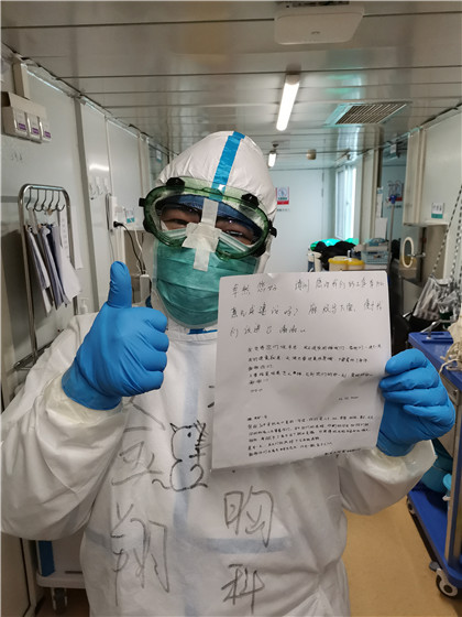 当我穿着厚重的防护服,戴着密不透风的医用口罩穿梭在病房时,透明玻璃那边的客人会加油打气般的冲我伸出大拇指;当我们将亲手折的花朵、爱心送给他们时,那一张张笑脸直击我的心扉;当我们想知道哪里还需要改进时,一段段感人的话语令我眼眶含泪,那一秒一切疲惫烟消云散。