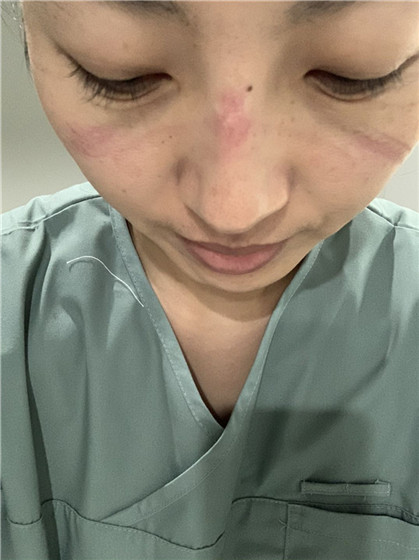 经过紧锣密鼓的培训,迎来了我第一天上班,穿上厚重的防护服进入了隔离区工作。但随之产生的心跳加速与呼吸不畅等不适让我始料未及,不由得产生各种焦虑与忐忑,这时我尽力暗示自己要保持镇定。连续工作数小时后,脱下防护服,镜子中的自己脸上、额头上都是深深的勒痕。虽然有种种不适,但对比排除疑似出院旅客脸上的笑容,一切都是值得的!