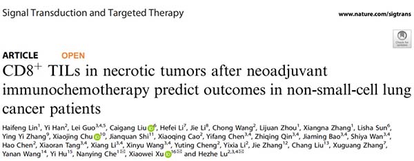 Lin, H., Han, Y., Guo, L. et al. CD8+ TILs in necrotic tumors after neoadjuvant immunochemotherapy predict outcomes in non-small-cell lung cancer patients. Sig Transduct Target Ther, 10, 335(2025). https://doi.org/10.1038/s41392-025-02435-0