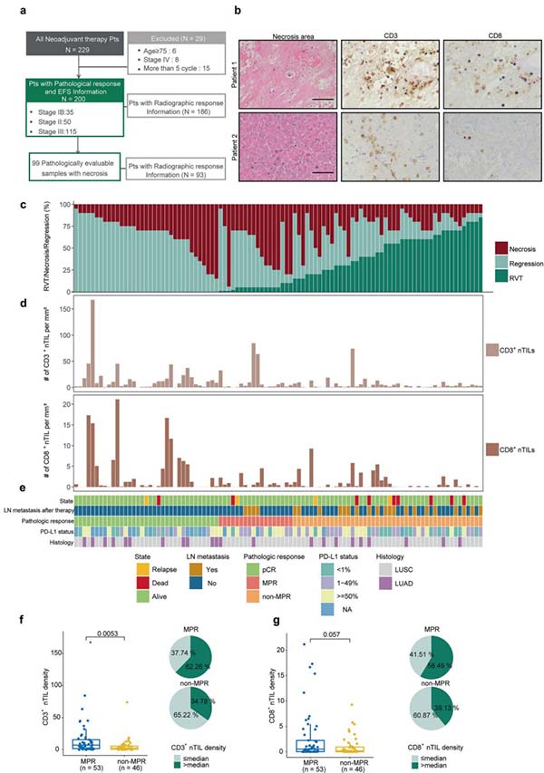 肺癌是全球癌症相关死亡的首要原因,其中非小细胞肺癌(NSCLC)占比最高。新辅助免疫联合化疗虽显著改善部分患者预后,但当前评估标准——如主要病理缓解(MPR,残留活肿瘤≤10%)和放射学反应(RECIST 1.1)——仍存在明显局限:约20%的MPR患者3年内复发,且放射学评估误判率达41.5%。本研究通过分析多中心200例NSCLC样本,提出CD8+ nTIL密度可作为更精准的预后预测指标。