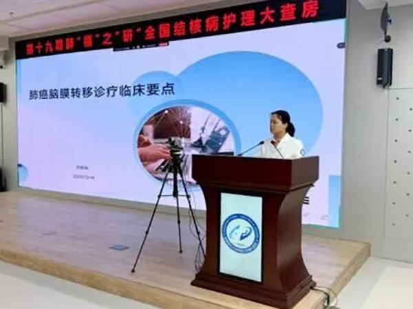 我院肿瘤中心二病区刘然汇报了“双病交织破迷雾、全人护理筑坦途—一例肺结核合并左肺上叶腺癌脑转移患者的护理”案例,面对肺结核的漫长战线与肺癌脑转移的严峻挑战,以多学科诊疗为基石,护理团队通过全程症状管理、心理支持和康复指导,为患者在荆棘之路上铺就一段更为平稳的坦途。肿瘤中心郑晓彬针对此案例,带来了《脑膜转移患者的诊疗特点》的专题讲座,聚焦脑膜转移患者临床特征、诊疗难点及护理要点,讲解深入浅出,帮助护理人员在面对复杂病情时,思路更加清晰,评估更具章法。