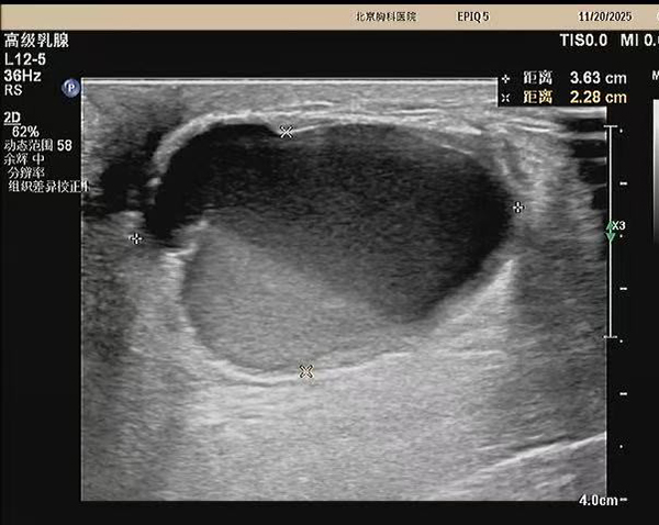 据悉,该患者三个月前自查发现左侧乳房有一质硬肿块,虽无红肿热痛等典型症状,但因担忧恶性病变而长期处于焦虑状态。就诊后,超声医学科主任王金萍迅速为其安排检查。超声影像显示:左乳3点位存在一大小约3.6×2.3厘米的混合回声包块。凭借丰富的临床经验,王金萍判断该病变为良性液性病灶,具备明确干预指征且无恶性风险。