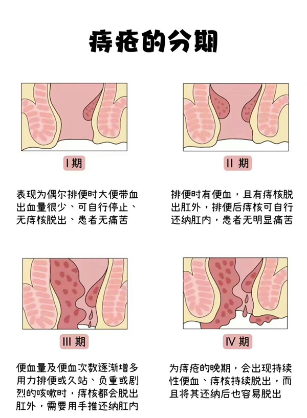 ● IV度: 偶有便血,痔核长期脱出,无法还纳或还纳后立即脱出。